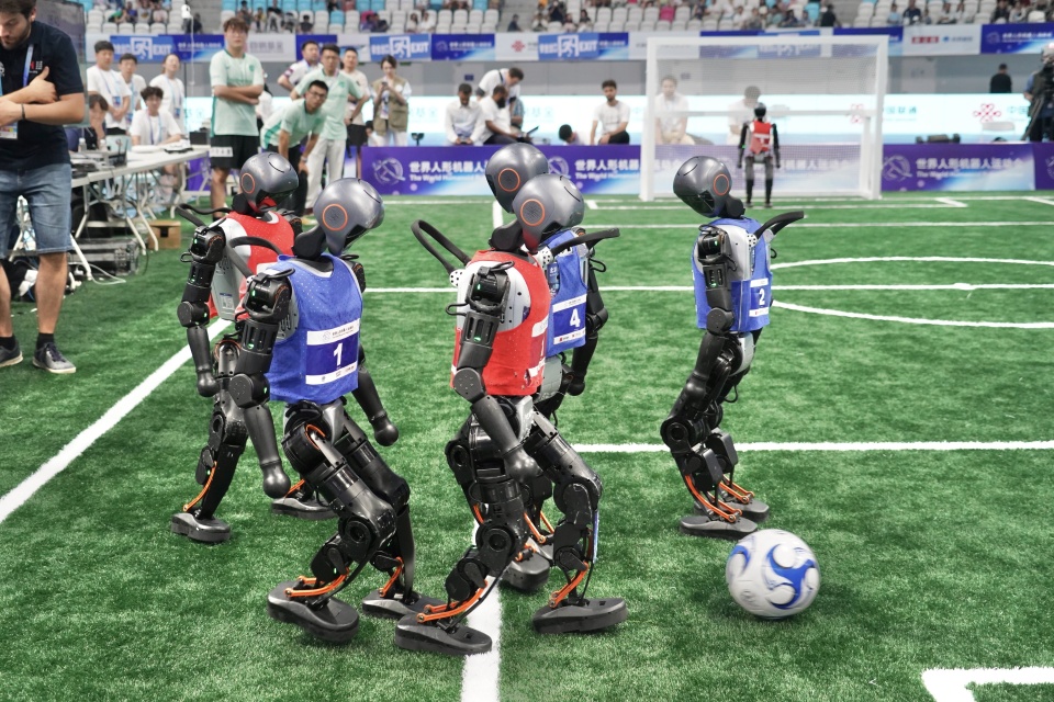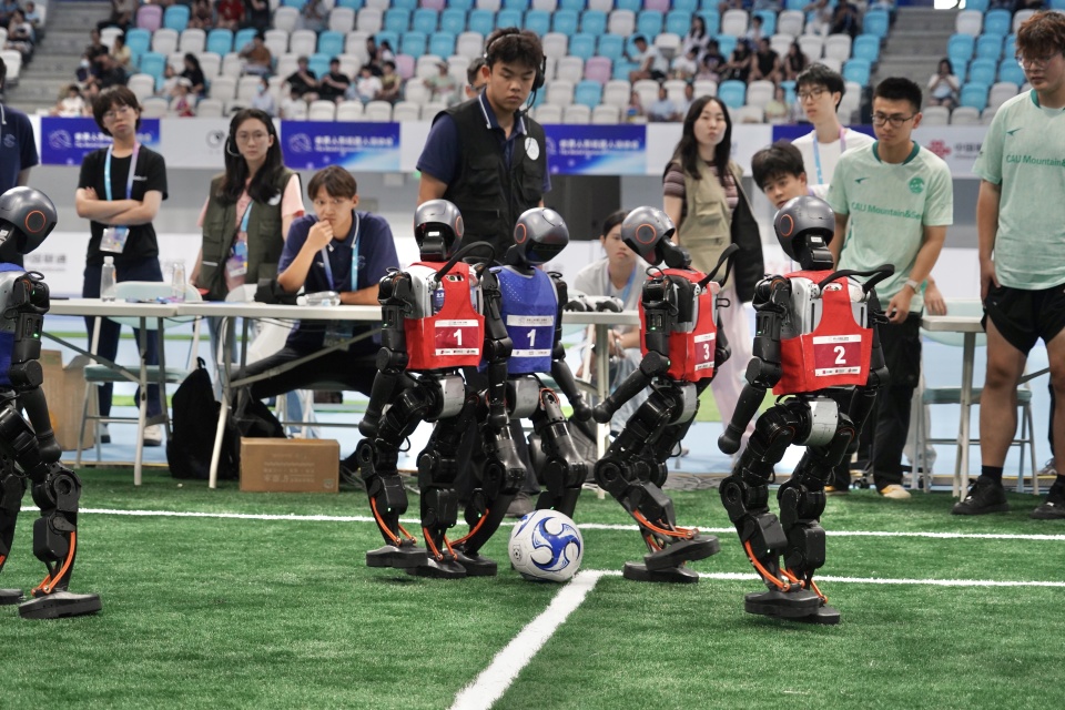 乐盈VI平台赛场上,攻防转换瞬息万变。一台机器人起脚,球精准地绕过“人墙”,不过对方守门员已预判落点,做出防守,把球踢回了中场。为了争夺球权,双方四台机器人同时扑向足球,一台机器人在对抗中踉跄倒地,现场观众发出一阵惊呼声。还不到3秒钟,机器人流畅地翻身爬起,迅速投入下一轮进攻,现场观赛者无不惊叹,欢呼声和掌声不断。